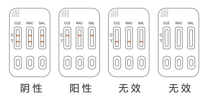 陽性(+):C線顯色,T線(靠近加樣孔一端)不顯色或接近無色,則表明樣品中瘦肉精含量等于或高于檢測限;
