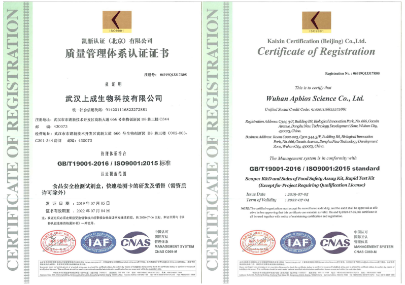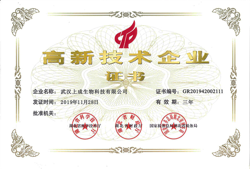 2019年7月5日,武漢上成生物科技有限公司通過了ISO9001:2015質(zhì)量管理體系的認(rèn)證,并順利取得證書。