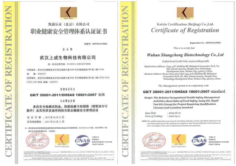 2019年6月12日,武漢上成生物科技有限公司通過了OHSAS18001:職業(yè)健康安全管理體系的認(rèn)證,并順利取得證書。
