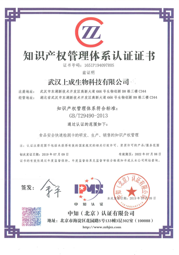 2019年7月9日,武漢上成生物科技有限公司通過了GB/T29490:2013知識(shí)產(chǎn)權(quán)管理體系的認(rèn)證,并順利取得證書。