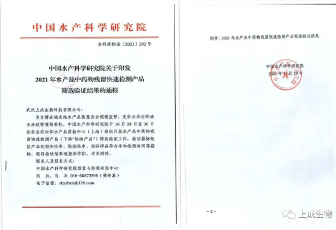 上成生物水產(chǎn)六項(xiàng)檢測(cè)卡通過2021年水產(chǎn)品藥物殘留快速檢測(cè)產(chǎn)品的篩選驗(yàn)證