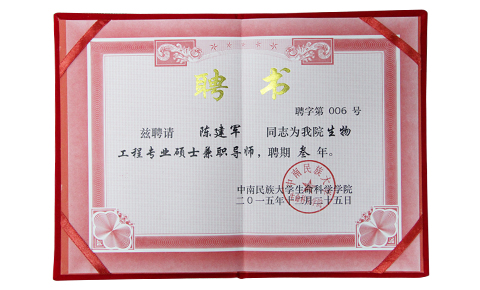 祝賀上成生物總經(jīng)理陳建軍同志被中南民族大學(xué)生命科學(xué)學(xué)院聘請為生物工程專業(yè)碩士兼職導(dǎo)師,聘期叁年。