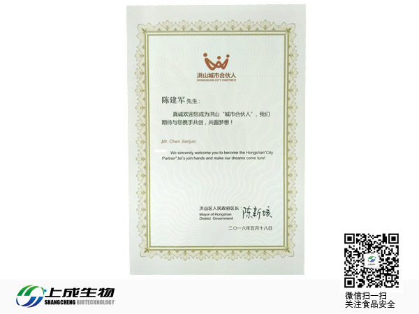 經(jīng)過(guò)申報(bào)推薦,考察認(rèn)定,首批16名洪山“城市合伙人”產(chǎn)生,武漢上成生物科技有限公司董事長(zhǎng)陳建軍成功入選,對(duì)入選的產(chǎn)業(yè)領(lǐng)軍人才及團(tuán)隊(duì),最高可獲得5000萬(wàn)元項(xiàng)目資助、股權(quán)投資等;儀式在區(qū)政府2號(hào)大廳舉行,區(qū)委書(shū)記黎東輝、區(qū)委副書(shū)記、區(qū)長(zhǎng)陳新垓、區(qū)委常委、常務(wù)副區(qū)長(zhǎng)楊元宏、區(qū)委常委、區(qū)委辦主任王高輝、區(qū)委常委、宣傳部長(zhǎng)萬(wàn)磊、區(qū)委常委、組織部部長(zhǎng)程春生、區(qū)委常委鄭杰,副區(qū)長(zhǎng)楊海松出席;區(qū)直部門(mén)、街鄉(xiāng)黨組書(shū)記、企業(yè)代表列席。
