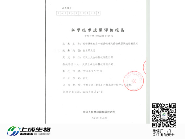 2016年9月27日,武漢上成生物科技有限公司研究成果“動物源性食品中硝基呋喃類藥物殘留快速檢測技術(shù)”通過國家科技部科研技術(shù)成果評價。