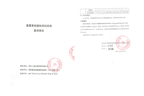 國家獸藥殘留基準(zhǔn)實(shí)驗(yàn)室(華中農(nóng)業(yè)大學(xué))氯霉素殘留檢測(cè)試紙條復(fù)核報(bào)告。