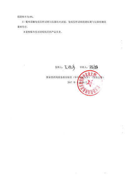 氟喹諾酮免疫層析試紙肉眼判讀檢測雞蛋中氟喹諾酮藥物時,假陽性率為0%,假陰性率為0%。與儀器對比試驗,免疫層析檢測結(jié)果與儀器檢測結(jié)果相符。